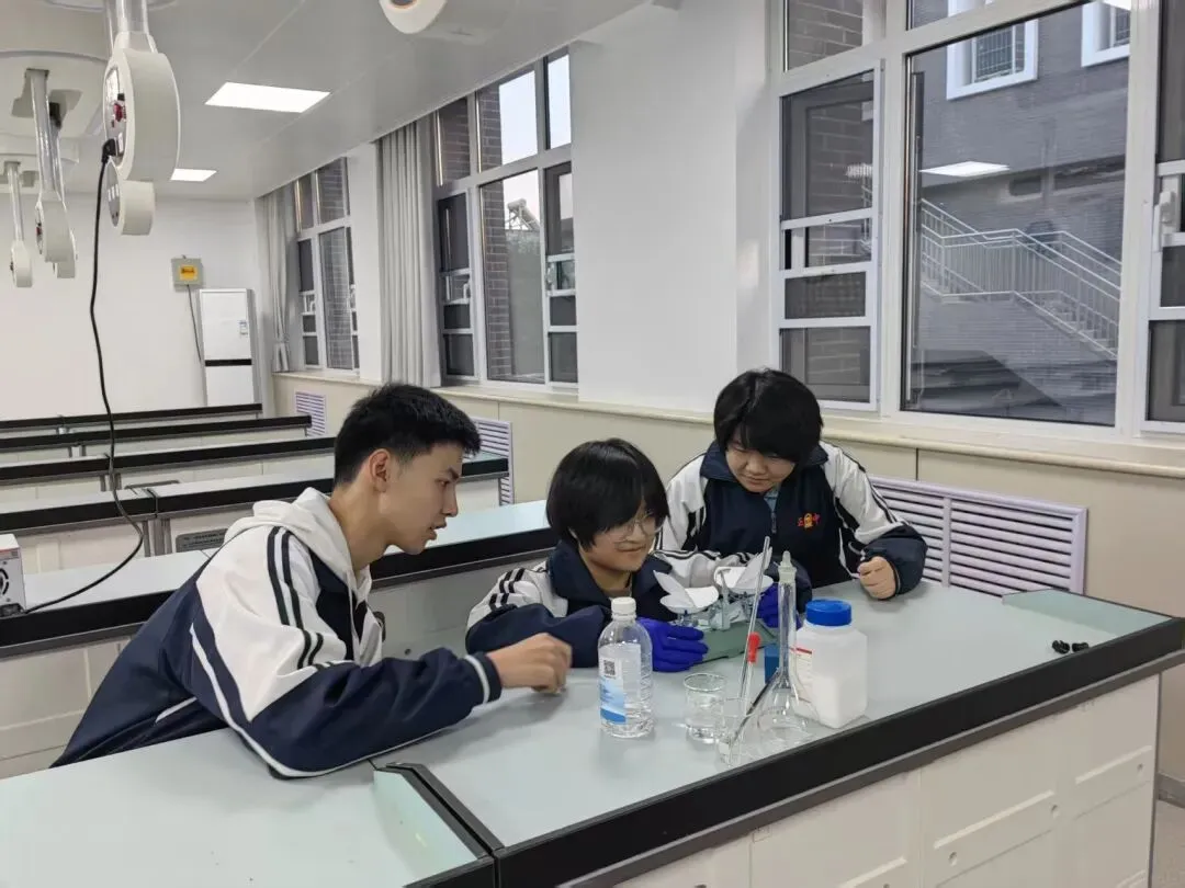 孙雨航、赵子墨、常铭瑶(从左至右)在讨论天平使用方法孙雨航介绍:“项目分为‘物化生’三部分,常铭瑶负责修复电机,赵子墨负责配置冷却液,我负责利用显微镜观察样本。”三人在练习时都遇到了不同程度的困难:无刷电机原理还没学过,常铭瑶利用课余时间查阅了大量资料才掌握了这部分知识;生物部分可供观察的样本量较小,在显微镜下调整位置很浪费时间,孙雨航通过反复练习找到了小窍门……