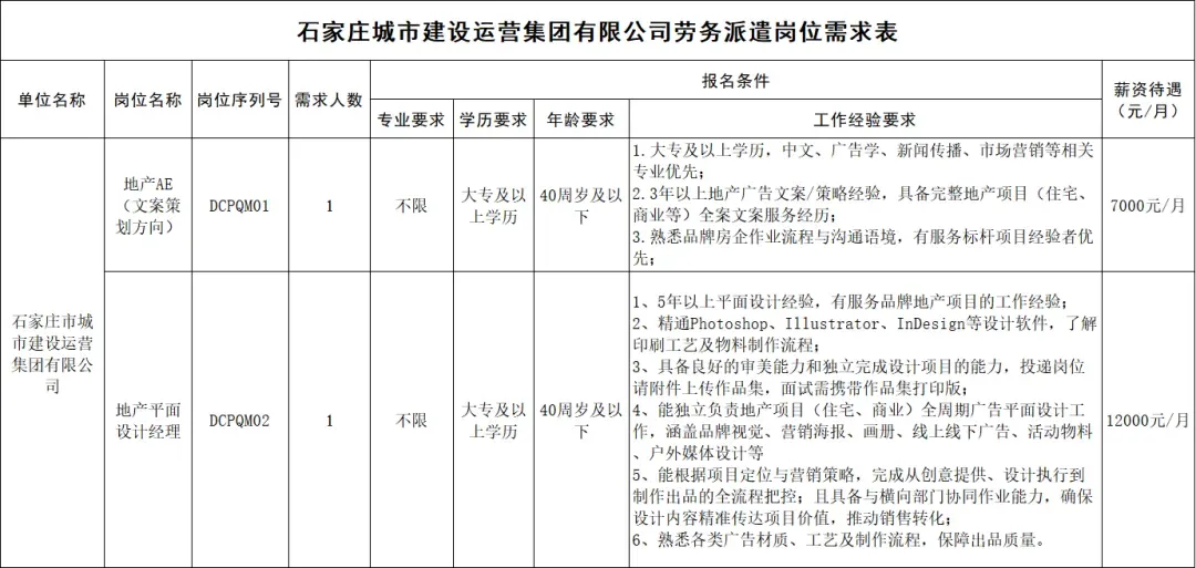 石家庄城市建设运营集团有限公司劳务派遣制人员招聘2人公告