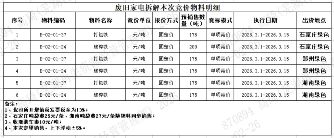 拟对以下物料价格进行竞价,下表中出售量仅供参考,最终数据以我司出售时过磅数量为准。竞价回收后,回收商不得以出售量与预估量不符提出任何异议。