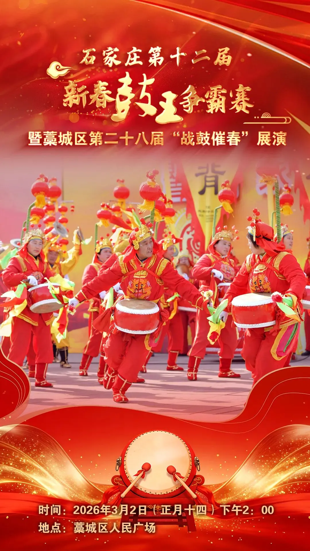 当马年的春风吹遍滹沱两岸,激昂的鼓点响彻活力之城。2026年石家庄第十二届新春鼓王争霸赛暨藁城区第二十八届“战鼓催春”展演将于3月2日(正月十四)下午在藁城区人民广场上演。本届赛事继续秉承“传承、创新、惠民”的宗旨,汇聚全市13个县(市、区)的14支民间鼓乐精英,为广大群众奉献一场属于丙午年新春的民间鼓乐艺术盛宴。