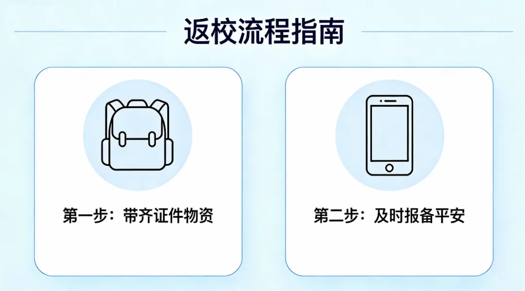 2. 及时报备平安:到宿舍后,第一时间向辅导员报备;独自返校同学,及时向家人报平安。