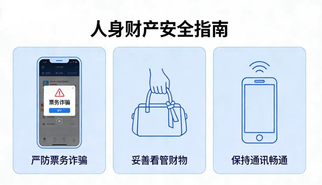 1. 严防票务诈骗:认准官方购票渠道,不信“内部票”“黄牛代抢”。收到“车次取消”等信息,通过官方客服核实,勿点不明链接、转账。