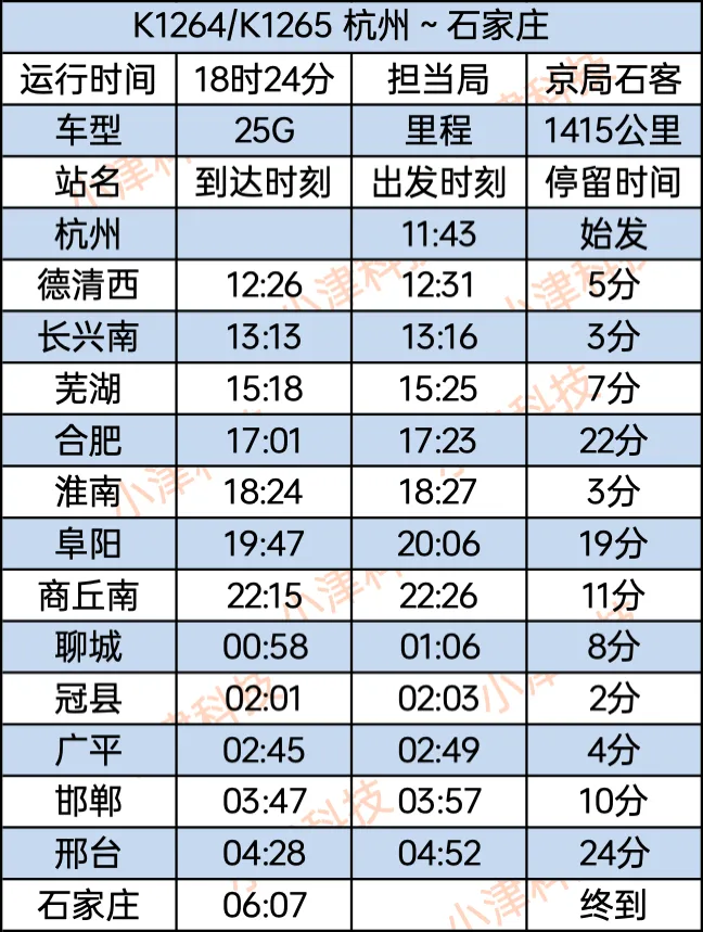 杭州站至石家庄站K1264/1265次列车运行18小时24分钟,石家庄站15:33始发,经停德清西、长兴南、芜湖、合肥、淮南、阜阳、商丘南、聊城、冠县、广平、邯郸、邢台,次日6:07终到石家庄站。