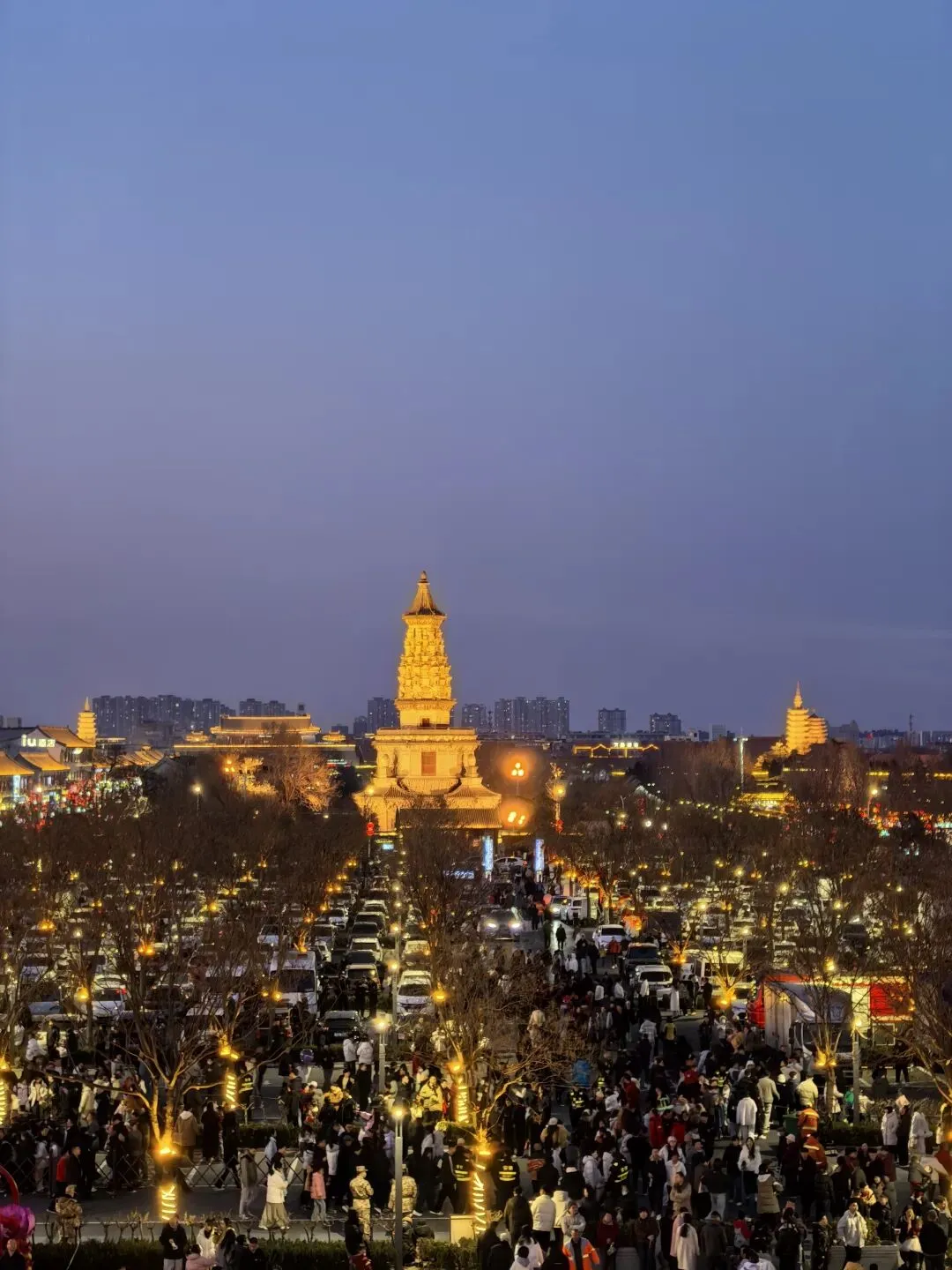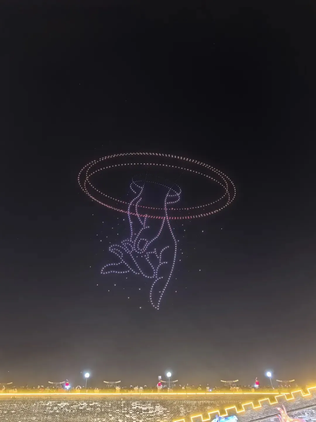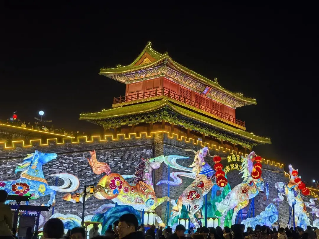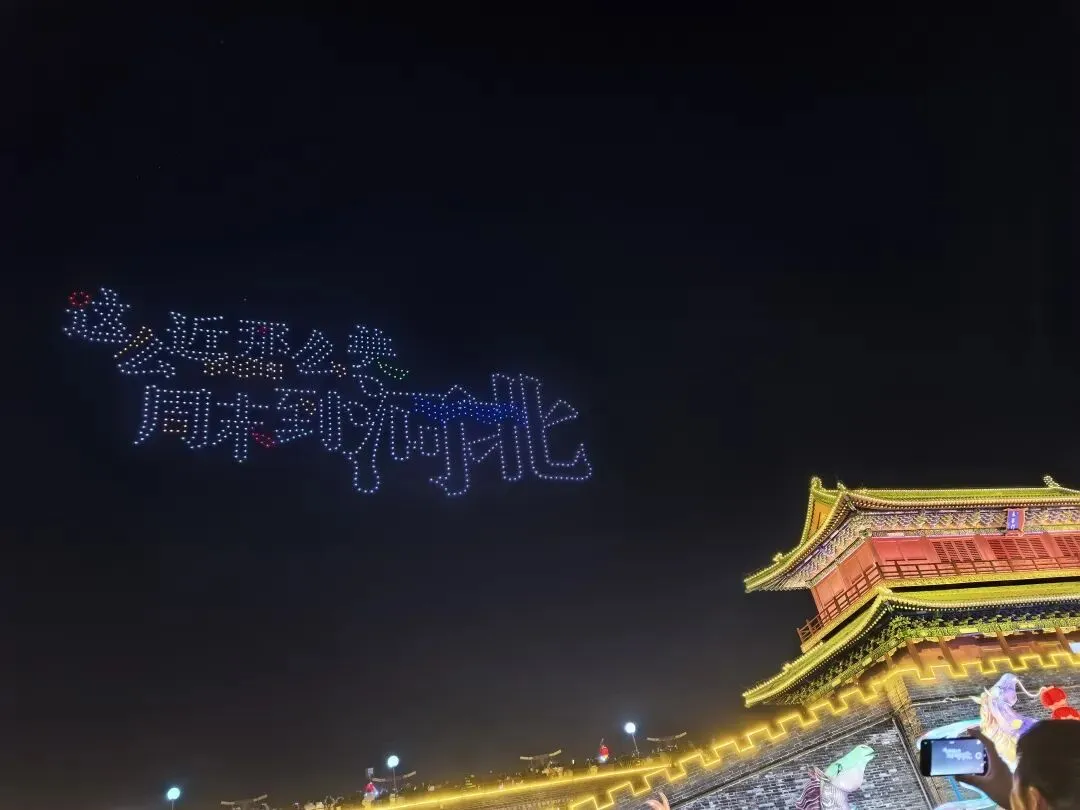 第一次体验城墙上的灯会,远眺城内的古塔,回程一路夜市吃吃吃,偶遇无人机表演......