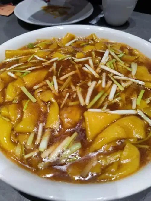 绿豆面摊成薄饼,切成菱形块,下油锅炸到金黄酥脆。关键在那个芡汁,醋和蒜的比例要刚好。出锅时,外焦里嫩,酸香扑鼻,咬一口"咔嚓"响,酸甜汁儿裹着豆香,特下饭。