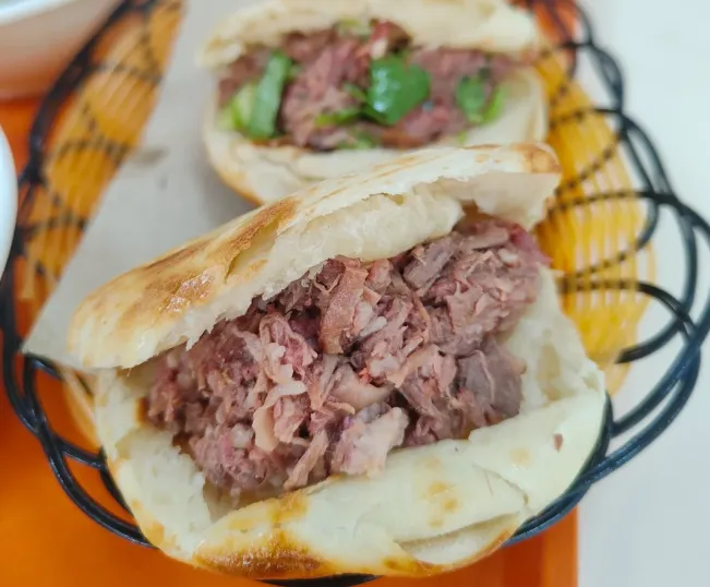 这里的驴肉火烧,和外地吃到的不一样。不是那种干巴巴的面饼夹着冷肉,而是热气腾腾的现烤。咬一口,你就知道什么叫地道。