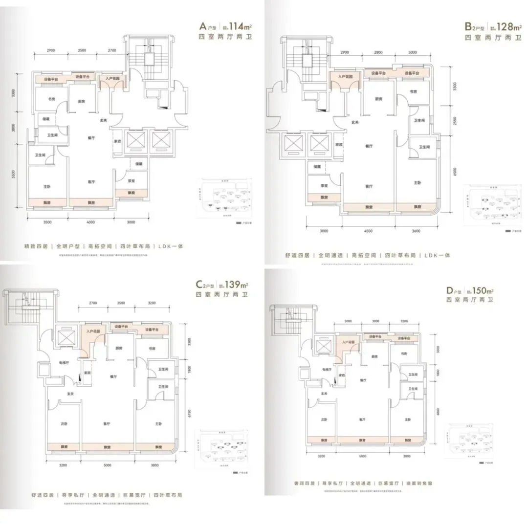 因为这个板块是为数不多的千亩大地块。面积段114-128-139-150平,全部是四居室,是新规,是4层的窗户做了隔音降噪