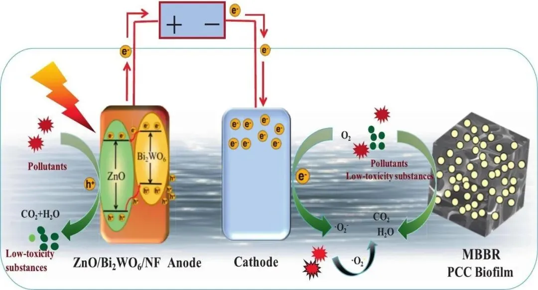 光电催化高级氧化技术(PEC-AOPs)利用光诱导的电催化氧化还原反应去除废水中难降解有机物。移动床生物膜反应器(MBBR)则通过悬浮载体上富集的微生物代谢作用降解污染物。针对PEC系统能耗高、稳定性有限,以及MBBR工艺处理高浓度有机废水效率较低等问题,本研究制备了ZnO/Bi₂WO₆/泡沫镍(ZnO/Bi₂WO₆/NF)复合光电极构建PEC系统,并以多孔聚氨酯水凝胶(PPC)为悬浮载体构建新型MBBR系统,进而将两系统间接耦合,形成PEC-MBBR一体化处理工艺。研究系统考察了单独PEC、单独MBBR以及PEC-MBBR集成系统处理印染废水的效能及影响因素。结果表明,当进水COD为650 mg/L时,单独PEC和MBBR系统均可稳定运行,COD去除率分别达到78.7%和80.3%以上。然而,当进水COD提升至1500–2500 mg/L的高负荷条件时,单独系统的去除率迅速下降至40%以下,凸显了其处理能力的不足。相比之下,在同等高负荷条件下(进水COD 2500 mg/L),PEC-MBBR集成系统表现优异,可将出水COD降至55 mg/L,去除率高达94.5%以上,并能连续稳定运行30个周期。该集成系统还展现出广泛的进水水质适应性和优异的抗冲击负荷能力。此外,采用PEC单元后接MBBR单元(PEC → MBBR)的运行模式兼具能耗低和处理效能高的双重优势。本文最后提出了PEC-MBBR系统协同增强印染废水处理效率的作用机制。