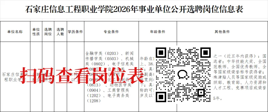 本次拟公开选聘学院专业建设急需的高层次人才1名,选聘的岗位、数量和选聘要求详见《石家庄信息工程职业学院2026年事业单位公开选聘岗位信息表》(见附件1)。