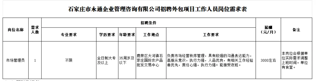2、本次公开招聘外包人员工作由石家庄永通企业管理咨询有限公司统一组织实施。