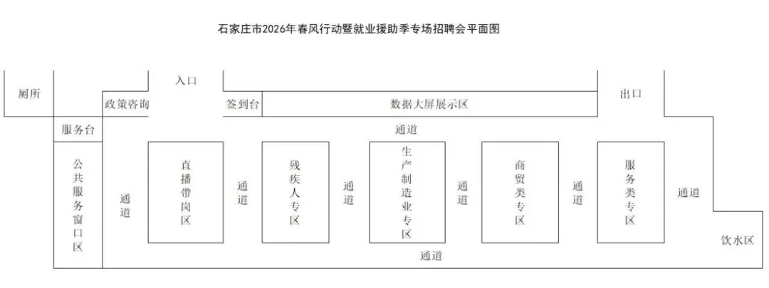 本次招聘会现场划分为企业招聘区、功能服务区、直播带岗区、政策咨询区等功能区。招聘区设残疾人专区、制造业专区、服务业专区、商贸业专区等专区。