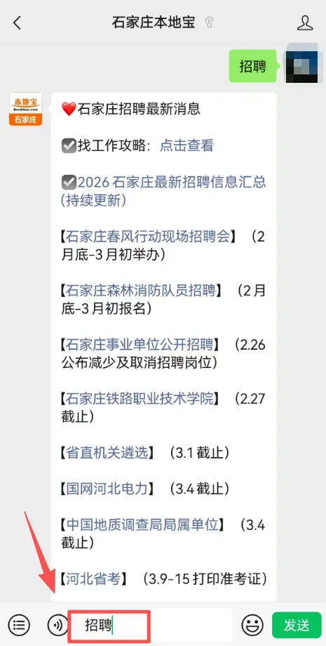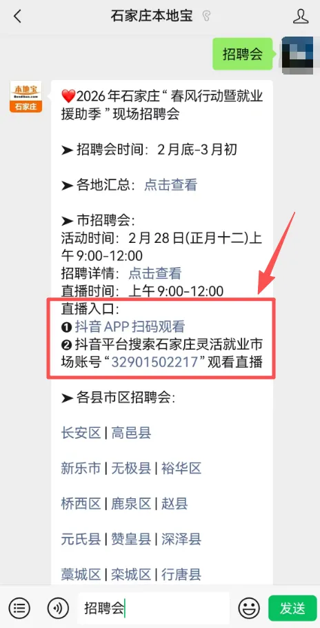 👉推荐服务:扫描或长按识别下方二维码,关注【石家庄本地宝】公众号,私信回复【招聘会】,即可获取直播入口,还可查看各县市区春风行动现场招聘会详情