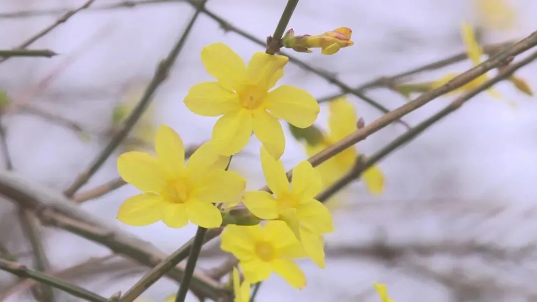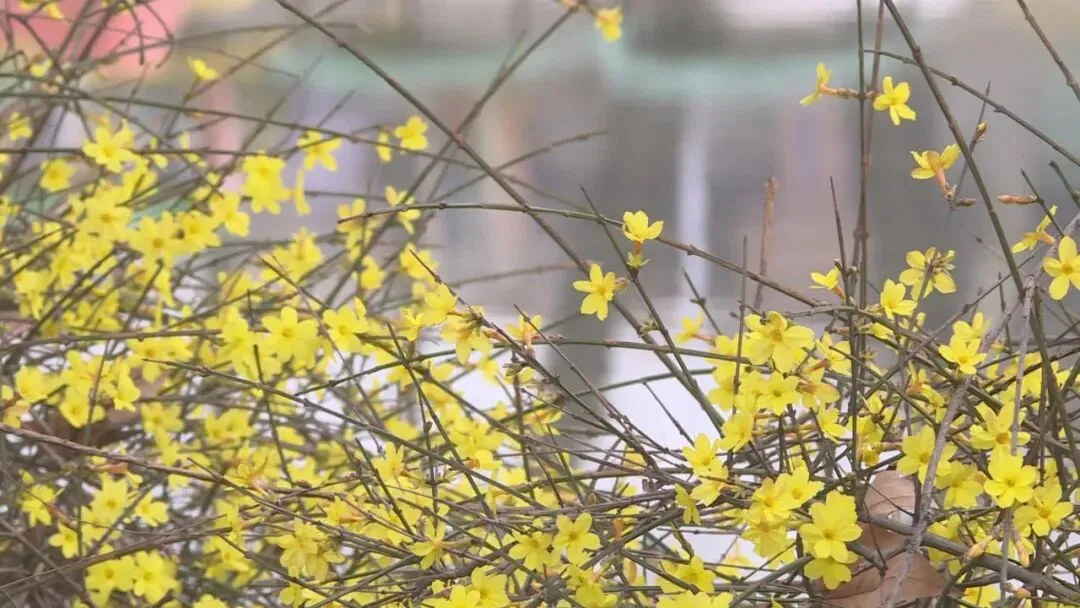与山桃交相辉映的,是一丛丛明艳的迎春花。“金英翠萼带春寒,黄色花中有几般”,是古人歌颂它的诗句。一朵朵小花玲珑精巧、金黄叠翠,作为春天灵动鲜活的信使,向人们传达着美好的春意。
