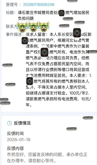 2026年1月18日,我通过石家庄12345市民服务热线,就家中燃气表产权归属、电池费用承担及设备占用室内空间等问题,咨询石家庄市城管局。依据《河北省燃气管理条例》,燃气表作为计量装置,其产权归燃气公司所有,维持其运行的电池作为必备动力,理应由产权方负责。然而,相关企业以“行业惯例”为由,将此项经营成本转嫁给居民。基于此,我提出了两点诉求:一是要求燃气公司将燃气表移至室外,若继续占用室内空间则应支付象征性的“租金”;二是要求燃气公司承担电池更换费用。