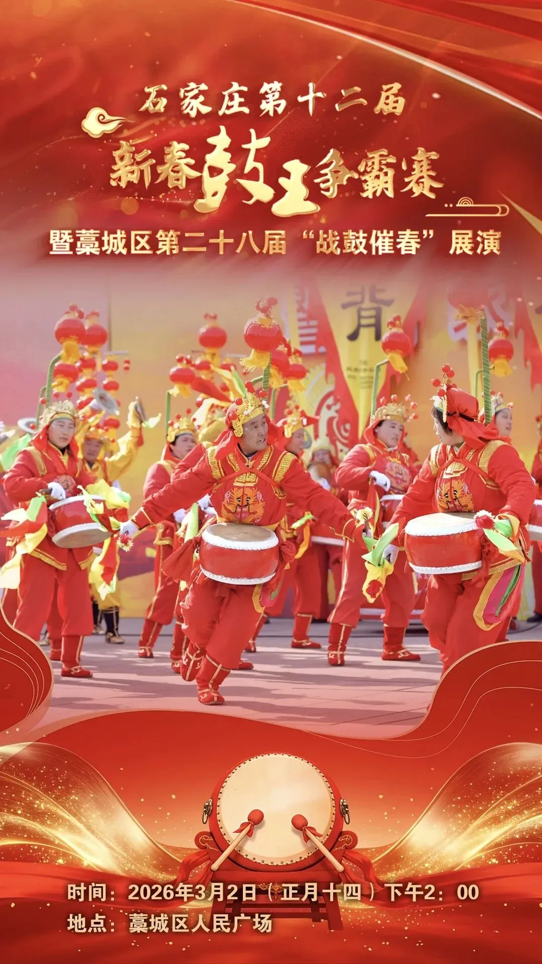 当马年的春风吹遍滹沱两岸,激昂的鼓点响彻活力之城。2026年石家庄第十二届新春鼓王争霸赛暨藁城区第二十八届“战鼓催春”展演将于3月2日(正月十四)下午在藁城区人民广场上演。本届赛事继续秉承“传承、创新、惠民”的宗旨,汇聚全市13个县(市、区)的14支民间鼓乐精英,为广大群众奉献一场属于丙午年新春的民间鼓乐艺术盛宴。