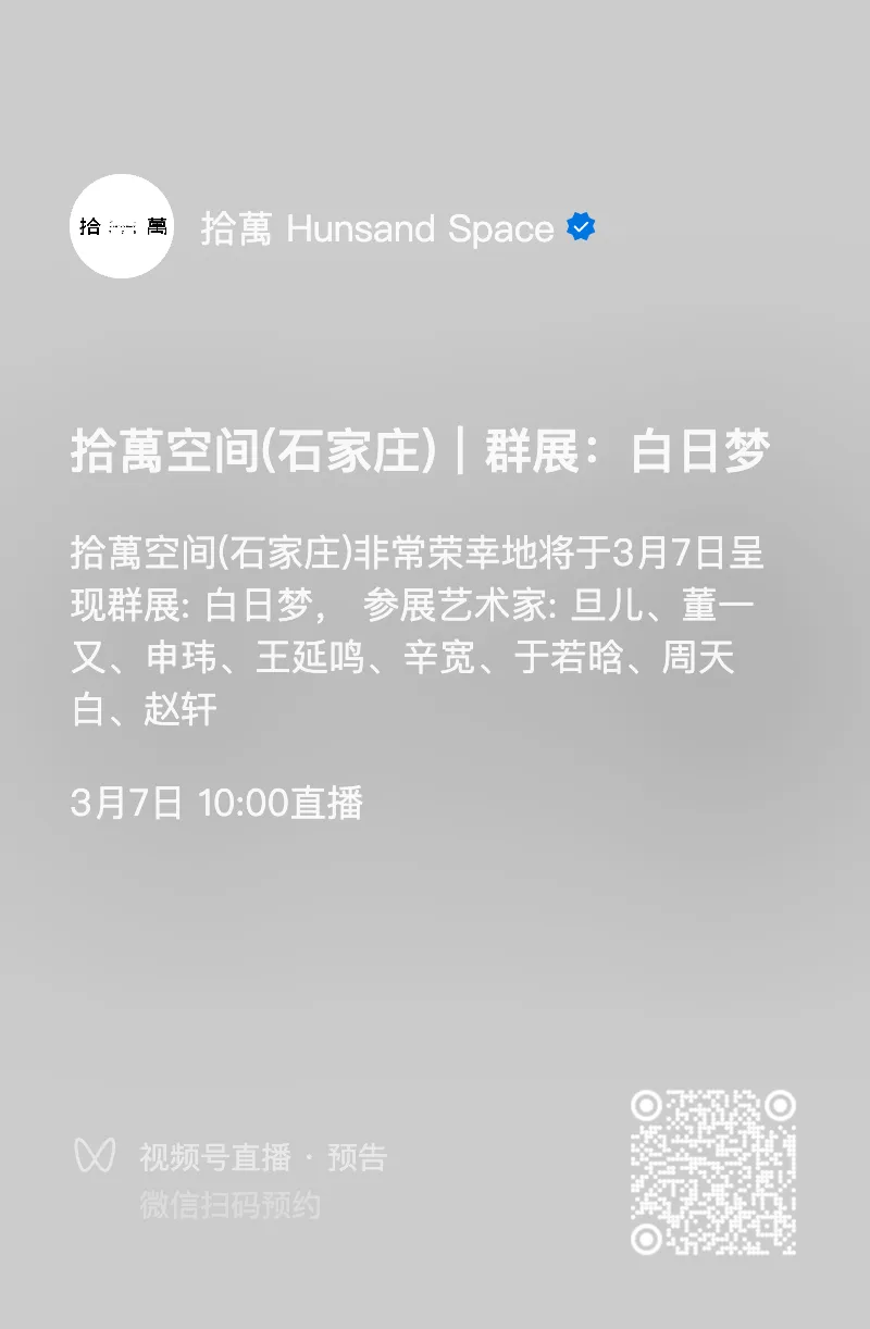 拾萬空间,于2014年成立于北京草场地艺术区,2018年迁址到北京798艺术区。2021年底开设石家庄分馆拾萬当代艺术中心,并于2023年底迁至石家庄市井陉县北障城村。2023年初在杭州市西湖区转塘街道的孵鸡湾建立分部。拾萬北京总部位于798包豪斯建筑集群中的一处二楼下陷式空间,石家庄分部深入到太行山古村落中的一座老教堂,而杭州空间则改造自龙坞茶山旁的一间农舍。拾萬空间对常规化的展览保持警惕,希望从当代艺术的语境出发,通过持续的展览和项目,来回应我们共同的生存境遇,激发出当下文化中被忽视的部分。