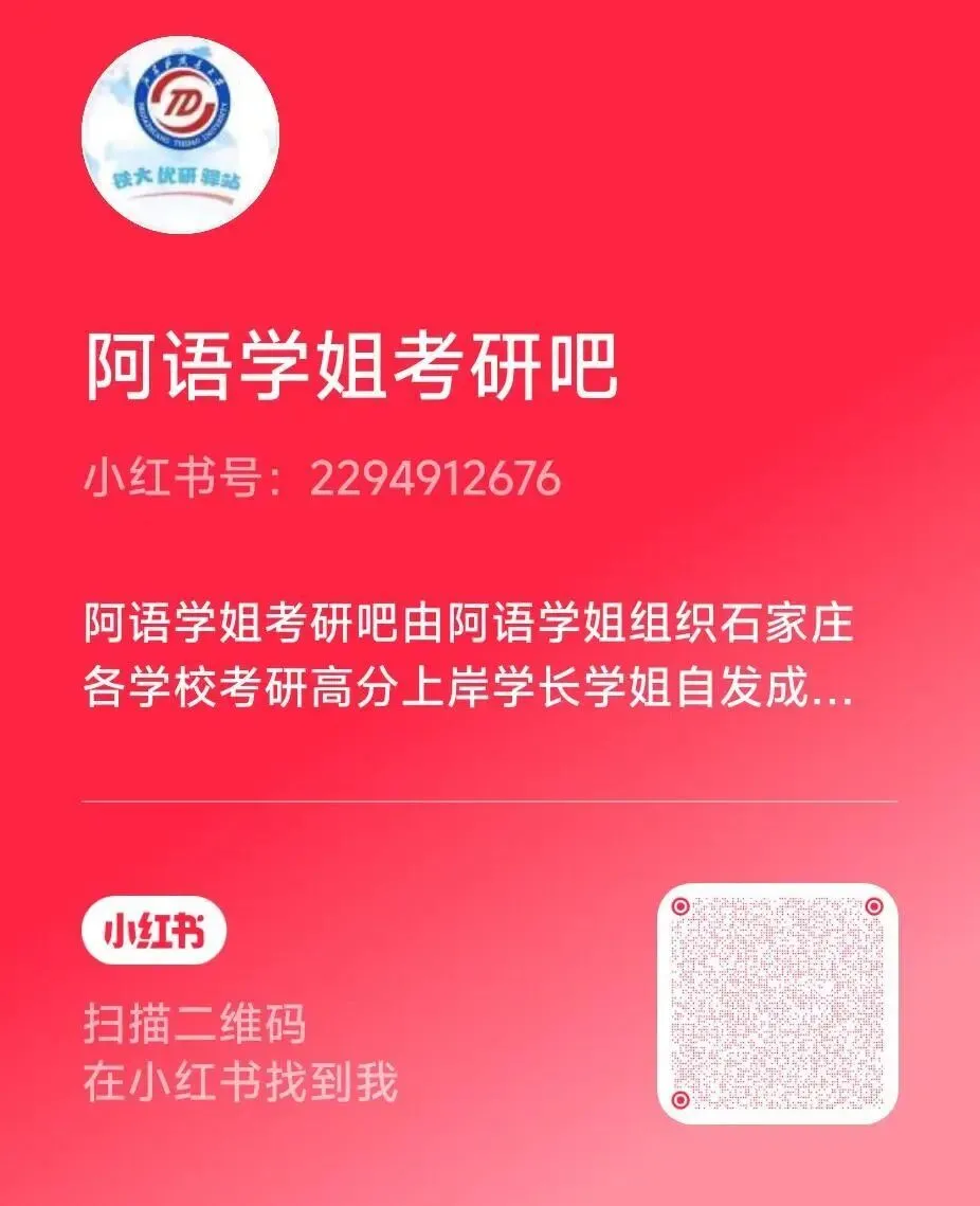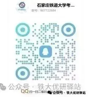 石家庄铁道大学优研驿站由铁大在读学长学姐自发成立,专注石家庄铁道大学考研,旨在帮助每一位学弟学妹了解上岸难度、明确备考方向、高效备考、少走弯路!!!需要考研初试、复试及调剂服务或者咨询更多石家庄铁道大学考研相关问题,请扫下方微信二维码,会有铁大直系高分学长学姐为你答疑解惑哦!!!