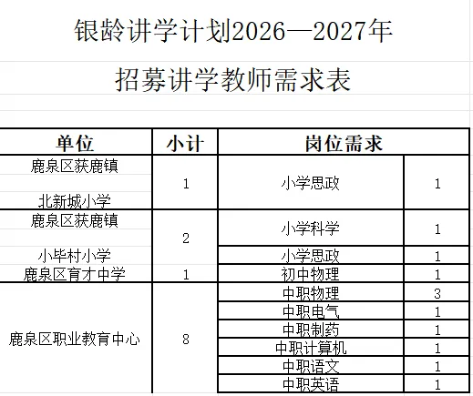 具体见《银龄讲学计划2026—2027年鹿泉区招募讲学教师岗位需求表》(附件1)。