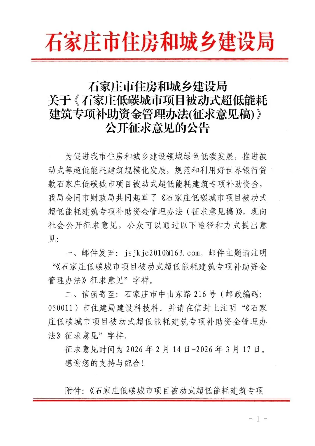 关于向社会公开征求《石家庄市住房和城乡建设局关于加快绿色建材推广应用工作的通知(征求意见稿)》意见的公告