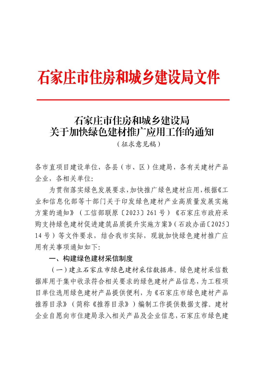 >关于向社会公开征求《石家庄市住房和城乡建设局关于加快绿色建材推广应用工作的通知(征求意见稿)》意见的公告