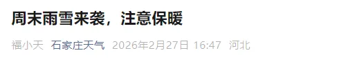 今天下午到夜间,张家口北部、承德北部、保定西部阴有小雪或零星小雪,石家庄、沧州及以南地区阴有雨夹雪或小雨,其中西部山区有小雪,其他地区多云间阴。明天白天,石家庄、沧州及以南地区阴有雨夹雪或小雪,其中邢台西部和南部、邯郸有中到大雪,其他地区多云。明天夜间到3月2日,保定、廊坊及以南地区阴有小雪或雨夹雪转多云,其中石家庄、衡水、邢台、邯郸有中到大雪,部分地区有暴雪,其他地区多云转阴有小雪或零星小雪。3月2日夜间到3月3日,张家口北部、承德阴有小雪或零星小雪转多云,局地有中雪,其他地区多云间晴。今天下午到夜间,渤海海域和沿海地区有东北风5到6级,阵风7到8级。3月1日夜间到3月2日白天,渤海海域和沿海地区有东北风5到6级,阵风7到8级。3月3日白天,北部地区有西北风4到6级,阵风7到8级。雪天行车极易出现