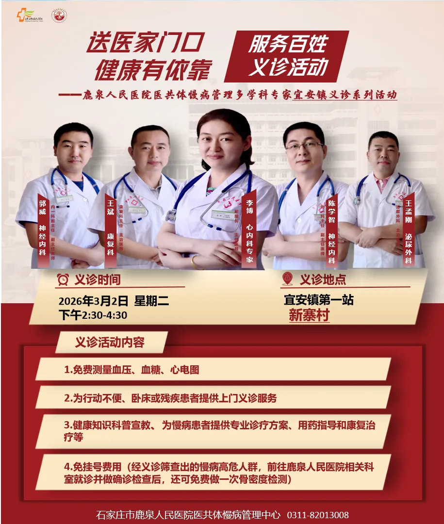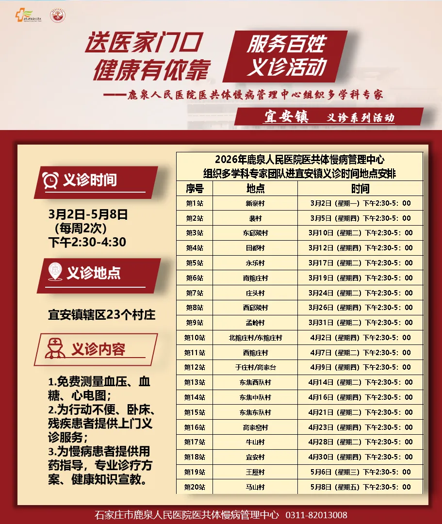 为进一步推动优质医疗资源下沉,让乡亲们在家门口就能享受到便捷、专业的医疗服务,石家庄市鹿泉人民医院将于2026年3月至5月在宜安镇开展为期三个月的巡回义诊活动。现将具体安排及相关事宜公告如下: