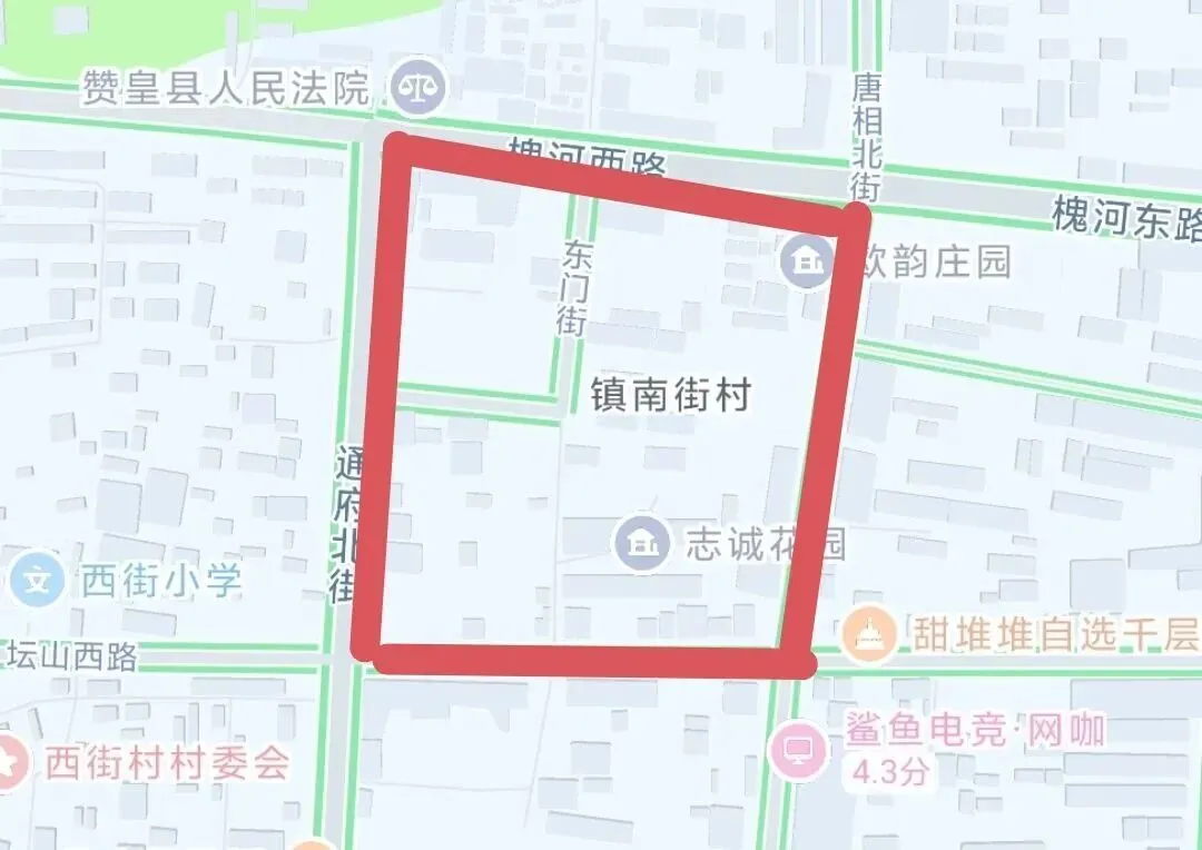 通府北街(坛山路口至政府门口)、坛山西路(老槐树至唐相北街)、唐相北街(旧广场至坛山路)、槐河西路(旧广场至政府门口)