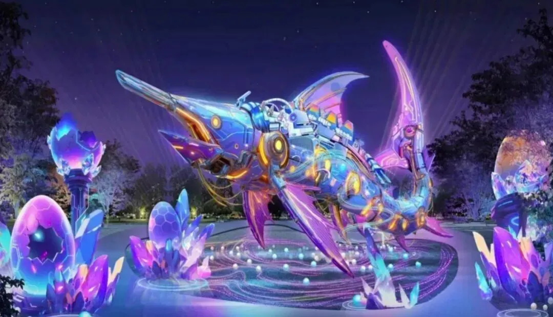 以《山海经》为灵感设计大型灯组 ,搭配超炫灯光秀和无人机表演,夜空瞬间变成奇幻画卷,“神隐山海・异兽贺春” 的震撼场面,错过真的会哭!