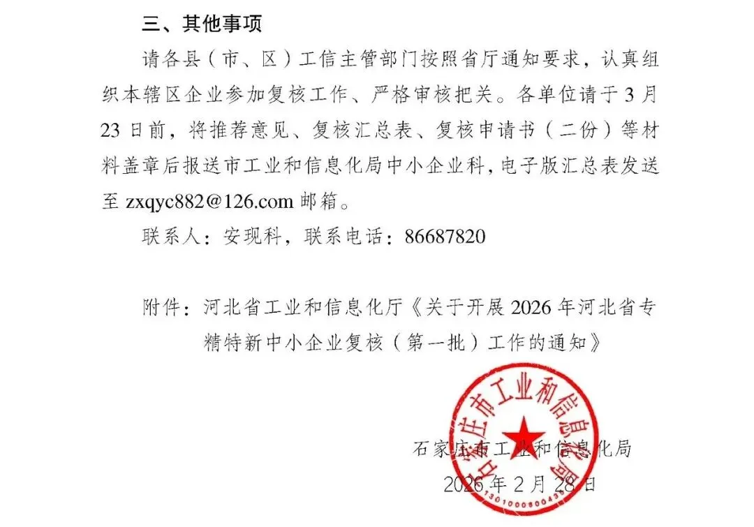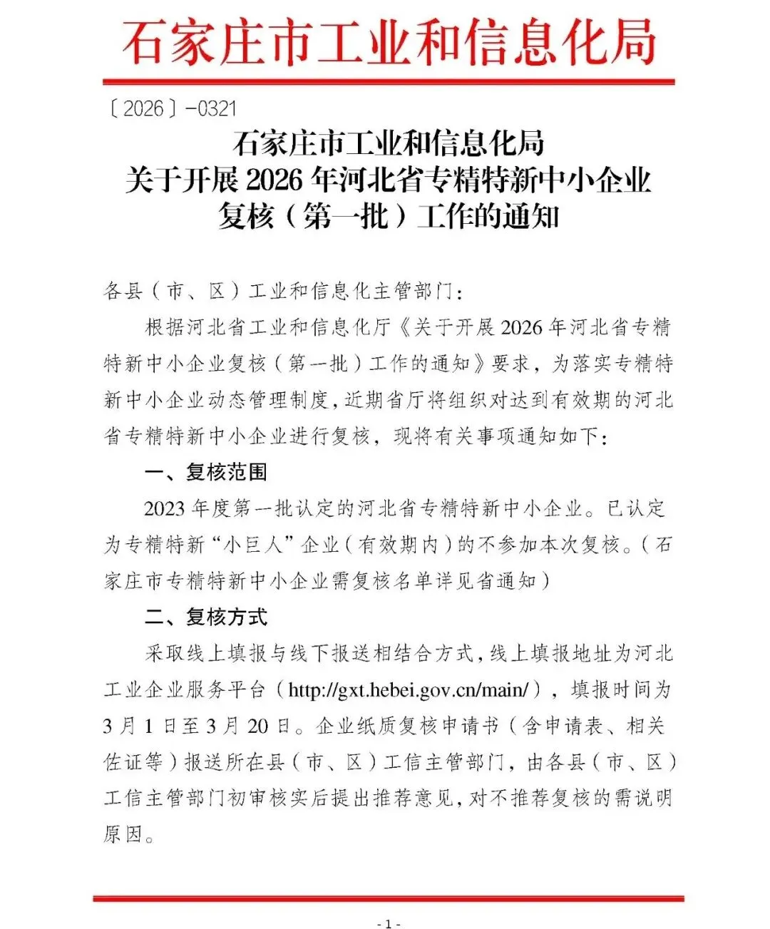 >石家庄市 | 关于开展2026年河北省专精特新中小企业复核(第一批)工作的通知