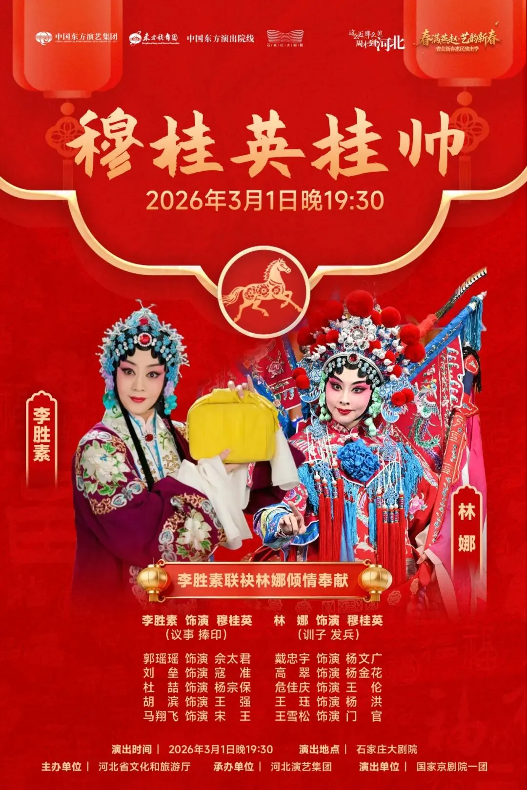 3月1日,国家京剧院一团倾力呈现的经典名剧《穆桂英挂帅》即将上演。著名京剧表演艺术家李胜素将与河北省京剧艺术研究院优秀青年演员林娜共同饰演穆桂英,两代青衣同台,共谱巾帼英雄的壮丽诗篇。