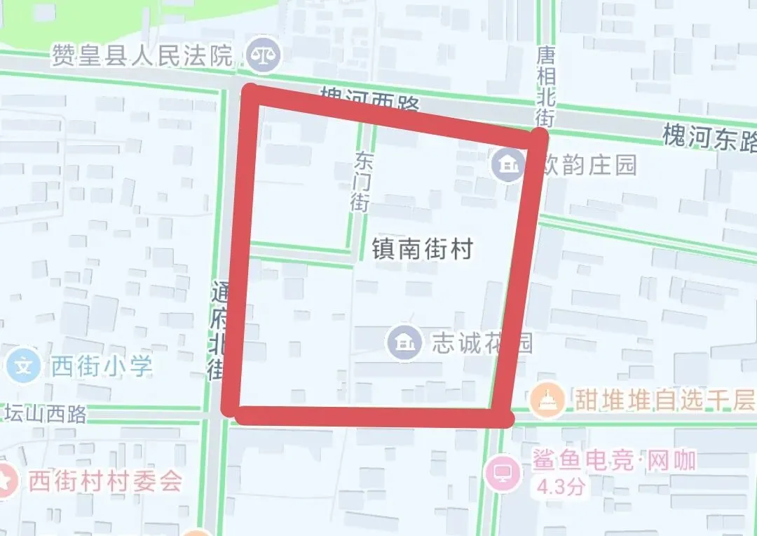 通府北街(坛山路口至政府门口)、坛山西路(老槐树至唐相北街)、唐相北街(旧广场至坛山路)、槐河西路(旧广场至政府门口)
