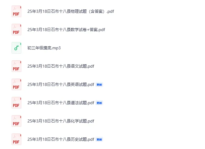 夸克网盘给你分享了「2025年石家庄十八县3月18日中考基模」,点击链接或复制整段内容,打开「夸克APP」即可获取。