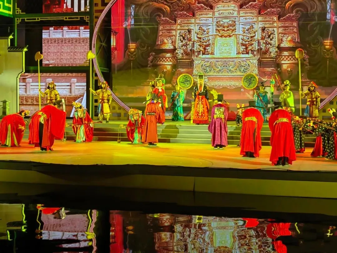 采用水幕投影与真人演绎结合的方式,融合了诗、词、乐、舞等多种艺术形式,舞美效果堪比春晚,视觉冲击力很强。乘船观看苏东坡“泛舟赤壁”,领略北宋文豪的诗意人生。4、《民国百戏》