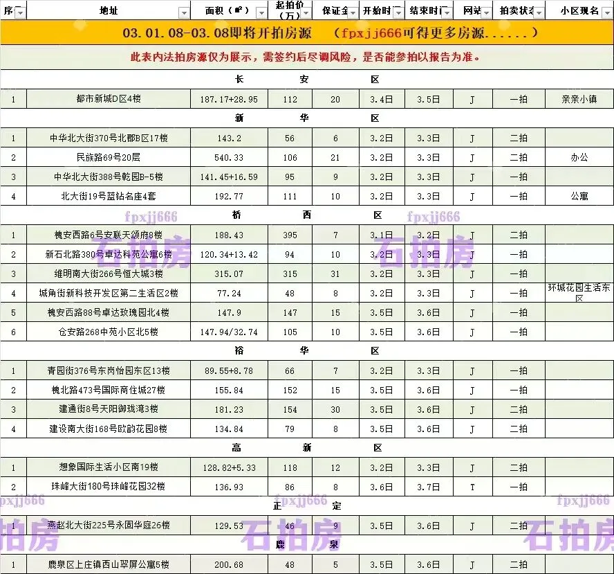 下周即将开拍房源,大家及时关注开拍日期,别错过,有任何问题,请微fpxjj666咨询!!!此表内房源仅为展示,需签约后尽调风险,是否可参拍以报告为准,请知悉。石拍房,买法拍,无风险,有保障!