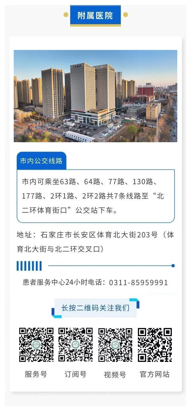 石家庄医学高等专科学校附属医院是一所非营利性三级综合医院,隶属于石家庄医学高等专科学校。医院位于石家庄市长安区体育北大街203号(体育大街与北二环交叉口东南角),占地60余亩。