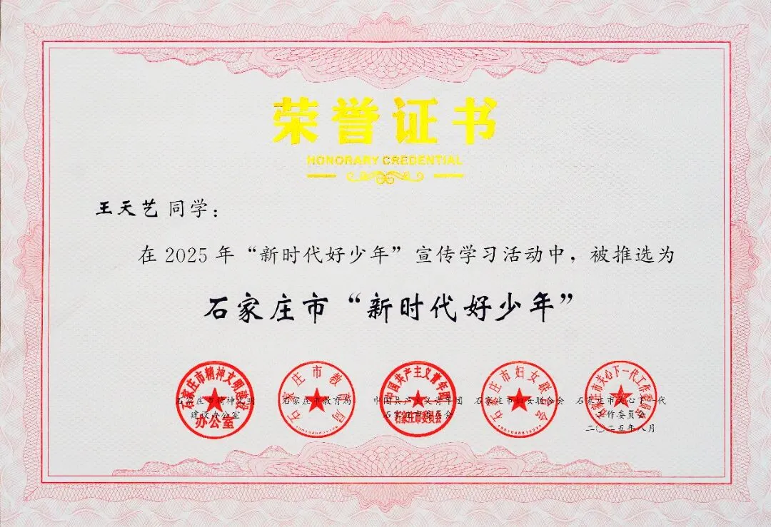 青春向善,笃行致远。王天艺以责立身、以善传暖、以恩践行,在校园里坚守责任,在实践中传递温暖,在成长中坚守初心。他用一言一行诠释着“石家庄市新时代好少年”的内涵,用实际行动书写着一中学子的初心与担当,用少年的赤诚与坚守,照亮自己与身边人的前行之路。未来,相信他将继续怀揣热爱、笃行不怠,不负荣誉、不负韶华,在逐梦路上奋勇前行,不断提升自我,践行家国使命,用青春之力,筑强国之梦,书写属于新时代少年的精彩华章!