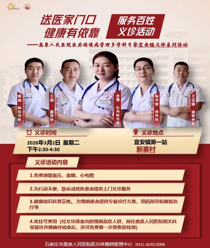 2. 如遇特殊天气或其他不可抗力,义诊时间可能会有调整,我们将第一时间在“石家庄市鹿泉人民医院”公众号发布通知。