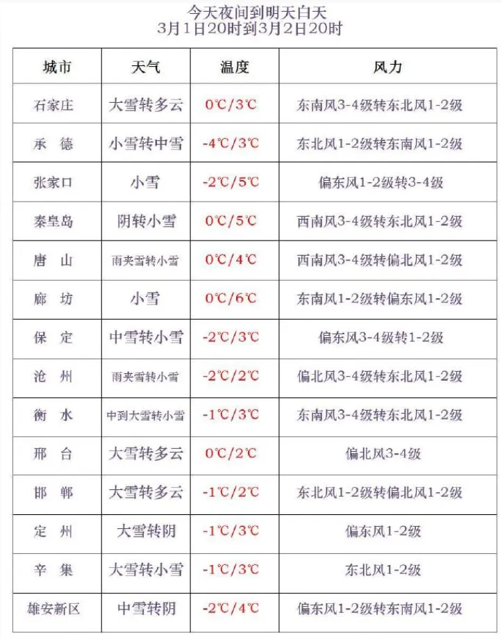 今天傍晚到夜间,全省阴,张家口和保定、廊坊及以南地区有小到中雪或雨夹雪,其中保定南部、石家庄、沧州、衡水、邢台、邯郸有中到大雪,部分地区有暴雪;其他地区有小雪或零星小雪。最低气温,张家口、承德、秦皇岛北部、保定西北部-10~-3℃,其他地区-2~1℃。