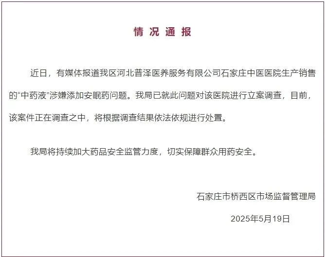 通报称,近日,有媒体报道桥西区河北普泽医养服务有限公司石家庄中医医院生产销售的“中药液”涉嫌添加安眠药问题,桥西区市场监管局将根据调查结果依法依规进行处置。该局表示,将持续加大药品安全监管力度,切实保障群众用药安全。