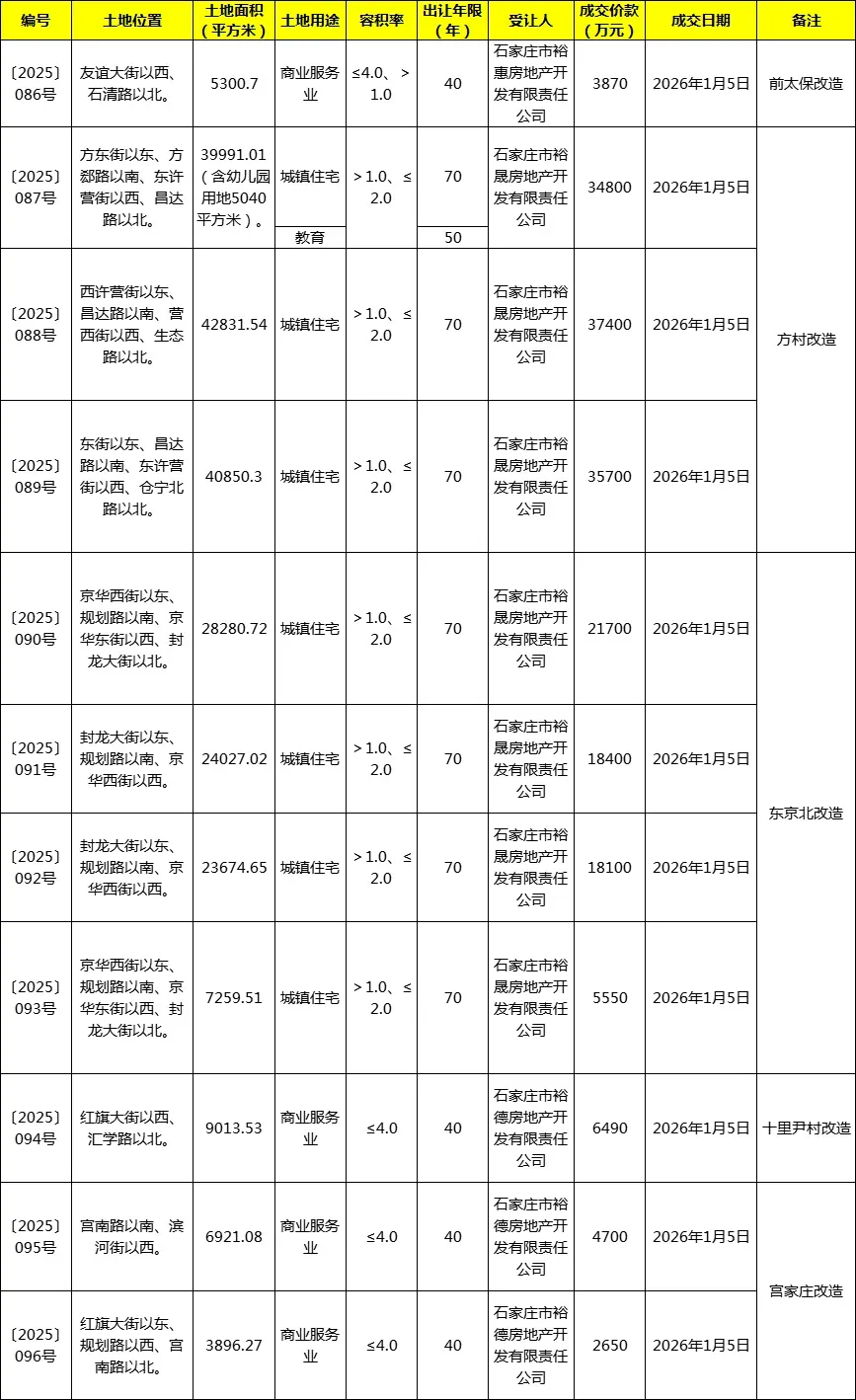 1月5日,石家庄迎来了2026年第一场土拍,主城区共11宗地块公开出让,土地编号为〔2025〕086-096号地块,总占地面积232046.33平方米(约355.58亩),包含城镇住宅、商服、教育用地等,总出让金额189300万元。值得注意的是,此次出让地块涉及前太保改造、方村改造、东京北改造和十里尹村、宫家庄改造用地,均由城发投旗下公司底价拿下。石家庄城发投集团于2021年10月13日揭牌成立,由原石家庄国控、地产、城投、住建4大集团以及15家国有企业整合而成,注册资本金300亿元,资产总额2750亿元,净资产约817亿元,是一家集融资、投资、建设、管理、运营等各项职能于一身的全产业链国有企业,是全省第一家取得AAA信用平台地市级企业。公司具有房地产开发二级资质、施工总承包一级资质、建筑工程综合一级检测资质、建筑设计甲级资质、市政工程施工总承包-级、城市及道路照明工程专业承包一级、房产测绘甲级资质以及相关行业的几十项业务资质。目前,城投集团拥有全资子公司12家,主营业务为城市建设投融资、城市基础设施建设、城市资源开发和运营管理等,承担了市政道路、桥梁、综合管廊、片区地产开发等基础设施建设工程及建材生产等。培育产业包括建筑房建、园林绿化施工、环保基础设施建设与项目运营等。业务基本涵盖城市基础建设各领域。自成立以来,城投集团建设完成了槐安路高架、中华大街高架、和平路高架、裕华路、新胜利大街、体育大街南延、建设大街南延、新客站东、西广场及配套路网、石家庄东站广场、南二环东、西延、天山大街、南水北调城区多座桥梁、环城高速、京港澳高速至机场路灯以及打通断头路等民生保障项目。倾力打造高铁片区、太平河片区、龙泉湖片区、和平东路片区等重点片区,大力推进城市更新重点项目建设的同时,强势拓展房地产开发业务板块,实力托举人居向往,自主开发了以“瑞凝府”“瑞璟丨春和”为代表的“瑞”系高端房产品牌,以“云歌朗樾”“云和赋”为代表的“云”系改善型房产品牌,以及雅郡、雅都园、华药南地块、华药北地块、电视机厂和前太保、十里尹村商品房等多个房地产项目,稳步提升了在石家庄房地产市场的市场规模和品牌影响力!关注下方公众号获取更多精彩内容