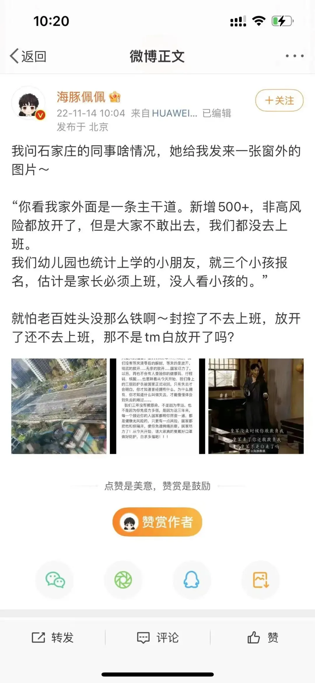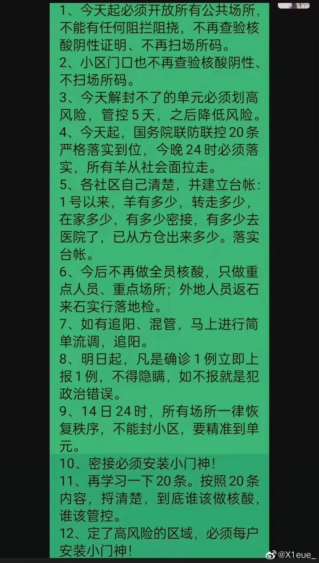 这两天全网都在围观石家庄,原因和当地的防控政策调整有关。先是@石家庄市人民政府网 发布了《致全体市民的一封信》:在这份信中,石家庄政府表示,他们将根据中央发布的《优化疫情防控二十条措施》进行整改,坚决防止“一刀切”“层层加码”和“一封了之”,把防控责任压实到最小单元,全力维护正常生产生活秩序。同时,“每个人都是自己健康的‘第一责任人’”,优化调整不是放开和躺平,大家要自觉遵守防疫基本行为准则和良好卫生习惯,发现疫情要主动报告、主动就诊。这封信是13号(周日)中午发的,起先并没有在互联网上引起太多的关注。直到昨天早上,石家庄的朋友们在网上爆料,说路边的核酸岗亭都没人了,学校的小朋友们因为“胳膊疼”“腿疼”集体请假了,很多公共场所也不需要扫码测温了。刚看到的时候我还有怀疑,在获得多方证实之后,我脑子里冒出了一个想法:石家庄是在给全国人民探路了。如果调整后石家庄的疫情防控形势能够平稳度过,大概率就会成为全国的样板而得到推广。10月31号,郑州卫健委以《新冠肺炎是自限性疾病,不可怕,可防可治》为标题,公开发表了一篇文章。该文称,新冠病毒感染是自限性疾病,大家不用过于惊慌,在做好防护的前提下,新冠肺炎可防可治。自限性疾病是个专业术语,指那些在发生发展到一定程度后,靠机体自身的调节就能控制住症状并逐渐恢复痊愈的疾病,比较常见的如水痘、流感、手足口病,都属于自限性疾病。但自限性疾病也是可轻可重的,像甲肝和猴痘也属于自限性疾病(另外,80年代就已经被消灭的天花,也被一些人认为是自限性疾病,这个致死率就高达30%了。但因为现在全世界只有美国和俄罗斯保留了天花病毒样本,所以关于天花病毒的公开研究相当有限,到底是不是自限性疾病,我看网上还有争议,这里也欢迎专业人士站出来指正)。所以我倒是认为,并不说新冠肺炎是自限性疾病就可以放松警惕了。但郑州卫健委这篇文章更大的意义在于,我认为它是舆论风向转变的一个标志。而舆论导向的其中一个作用,就是给政策的施行做好铺垫。11月11号,国务院发布了《关于进一步优化新冠肺炎疫情防控措施 科学精准做好防控工作的通知》,通知中列举了20条具体措施,也被简称为《优化疫情防控二十条》。调整之后,密接的隔离从7+3缩短到了5+3,次密接则不再需要进行隔离;入境人员的隔离也从7+3缩短成5+3,对入境人员阳性的判定标准下调到CT值<35,并取消入境航班熔断机制;简言之,就是对国内、国外的人员流动都进行一定程度的优(放)化(松)。风险区从“高、中、低”三挡简化成为“高、低”两档,“最大限度减少管控人员”;“高风险区一般以单元、楼栋为单位划定,不得随意扩大,一般不按行政区域开展全员核酸检测……”除此之外,《优化疫情防控二十条》还明确提出,严禁随意封校停课、停工停产停诊、随意采取“静默”管理、长时间不解封等“一刀切”和层层加码行为,等等。为了确保优化政策能顺利落地,国家还准备一系列的措施。国家疾控局副局长常继乐还向社会公开了一系列的数据,其中就包括:次密接感染率只有十万分之3.1(所以次密接不再需要集中隔离了);中风险地区阳性检出率只有十万分之3(所以不再划分中风险地区了);奥密克戎的最长潜伏期是8天(所以隔离时间改成5+3了);闭环管理作业的高风险人员阳性感染率为十万分之1.6,比次密接还低(所以这些人员不再需要集中隔离,改为5天居家健康监测)……而国家疾控局向全社会公开这些数据,显然就是希望能够借此打消老百姓的怀疑和顾虑,以便于政策落地。当然,“动态清零”这个总方针在名义上肯定还是不会变的,在事实的过程中它可能会慢慢淡化,但不会被否定。接下来就是13号,石家庄政府《致全体市民的一封信》了。但你再想一想,这真的是市政府或者省政府能够决定的吗?疫情防控作为写入大会报告的一项重点工作和重大成绩,在做出重大调整之前,难道不需要经过更高层的拍板吗?所以石家庄这次的调整,我认为其实是在“奉命行事”,是在获得了授权之后,在为全国打样板、做试点。既然是要给全国打样,那试点的选择就要有一定代表性。在诸多因素中,人口总数和密度直接影响到一个地方医疗系统所将承受的极限压力,而石家庄是一个千万级人口的大城市(截至2021年末,石家庄市常住人口1120.47万人),具备这一条件。石家庄目前每天4、5百的阳性病例恰恰出于起步阶段,到高峰时会给医疗系统带来多大的挑战,需要我们密切关注。(从数据上看,石家庄昨天检出的阳性病例数出现了下降,但我认为这个数据并不能反映真实情况,因为取消免费核酸后,很多人就不去做检测了,那测出来的阳性数量自然就少了,关键还是看后续医疗系统能不能撑得住)毕竟防控措施优化之后,会出现什么局面还有一定的不确定性。如果在北上广深做试点,一旦出现预料外的突发状况,试错的成本会非常之高,影响会非常之大。网上还有一种声音是,防控政策的优化调整为什么不在明年春天后再进行,毕竟冬天本来就是病毒活跃的时期啊。如果打算在明年春天进行全国范围内的推广,那试点工作就要提前几个月进行。高强度的防控措施,是会不断地消耗大量的人力、物力和财力的。上半年受疫情冲击最大的上海,反而是亏空最少的,其他省市的压力可想而知