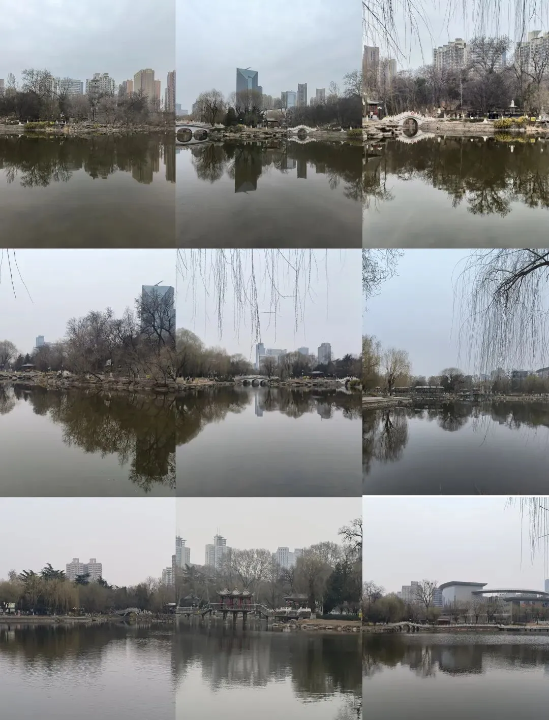 穿过牡丹园,来到中心湖岸边的步道,沿着步道环绕一圈,看到两岸的楼宇树木倒映湖中,显得那么清幽雅静。时而细波微澜,时而平如镜面,走在湖边,仿佛沉浸在人间仙境;细赏柳丝,才悟“二月春风似剪刀”的魅力。