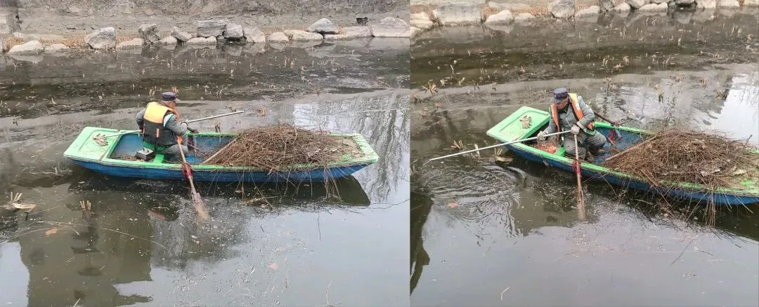 走到湖的南岸,看到这里正有一位工人师傅独自坐在小船上,手持一根细长的“耙子”正在捞落入水中的干树枝。这根耙子的耙头很窄,只有几个耙齿。就问师傅,“耙齿那么少,捞起来很费劲吧?”师傅回答说,“耙齿多了,捞起来更费劲呢”,好像很有哲理的。