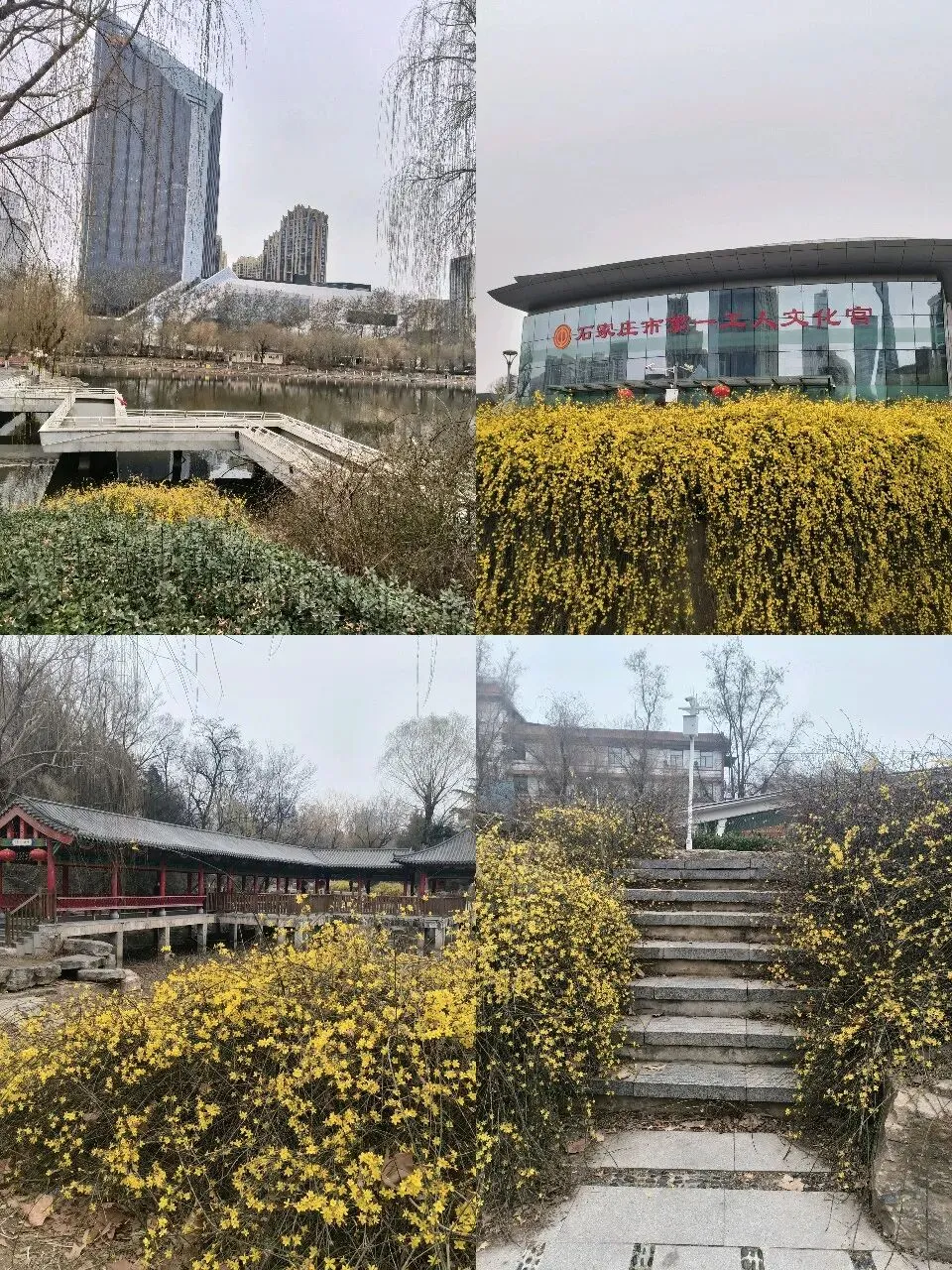 一是文化宫西侧的迎春花开的更鲜艳,花枝延伸到进入车库的通道处(目前是封闭状态),倒像是瀑布一般。公园其他地方也有迎春花盛开。