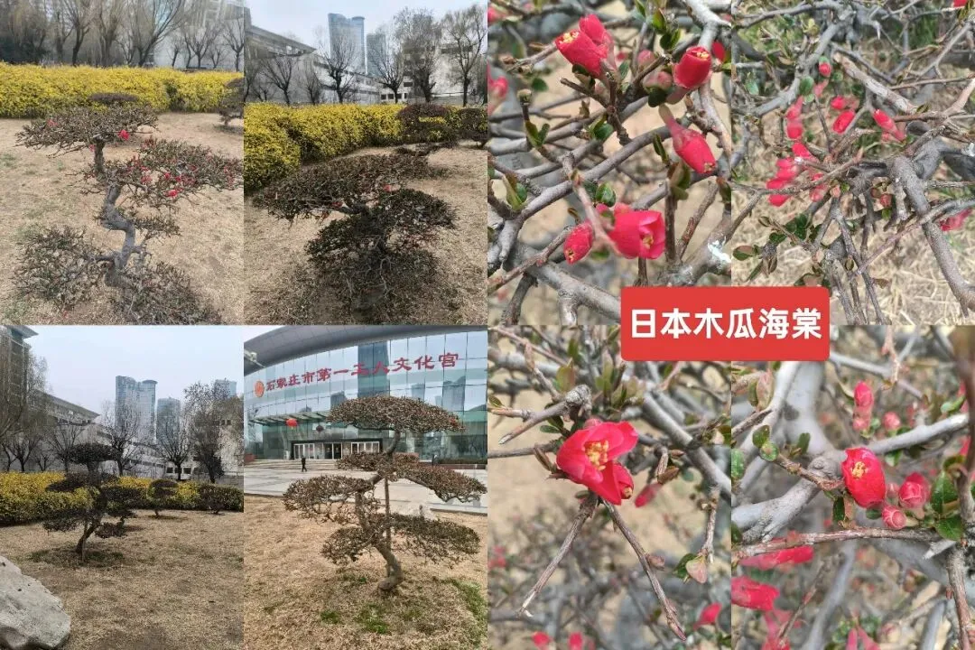 二是在花圃中有几棵造型别致的植物,不知道是什么树种,枝头有很多的花骨朵含苞待放,有一两朵好似“犹抱琵琶半遮面”。用识花君扫了扫,告知是“日本木瓜花”,属于木瓜海棠属的。