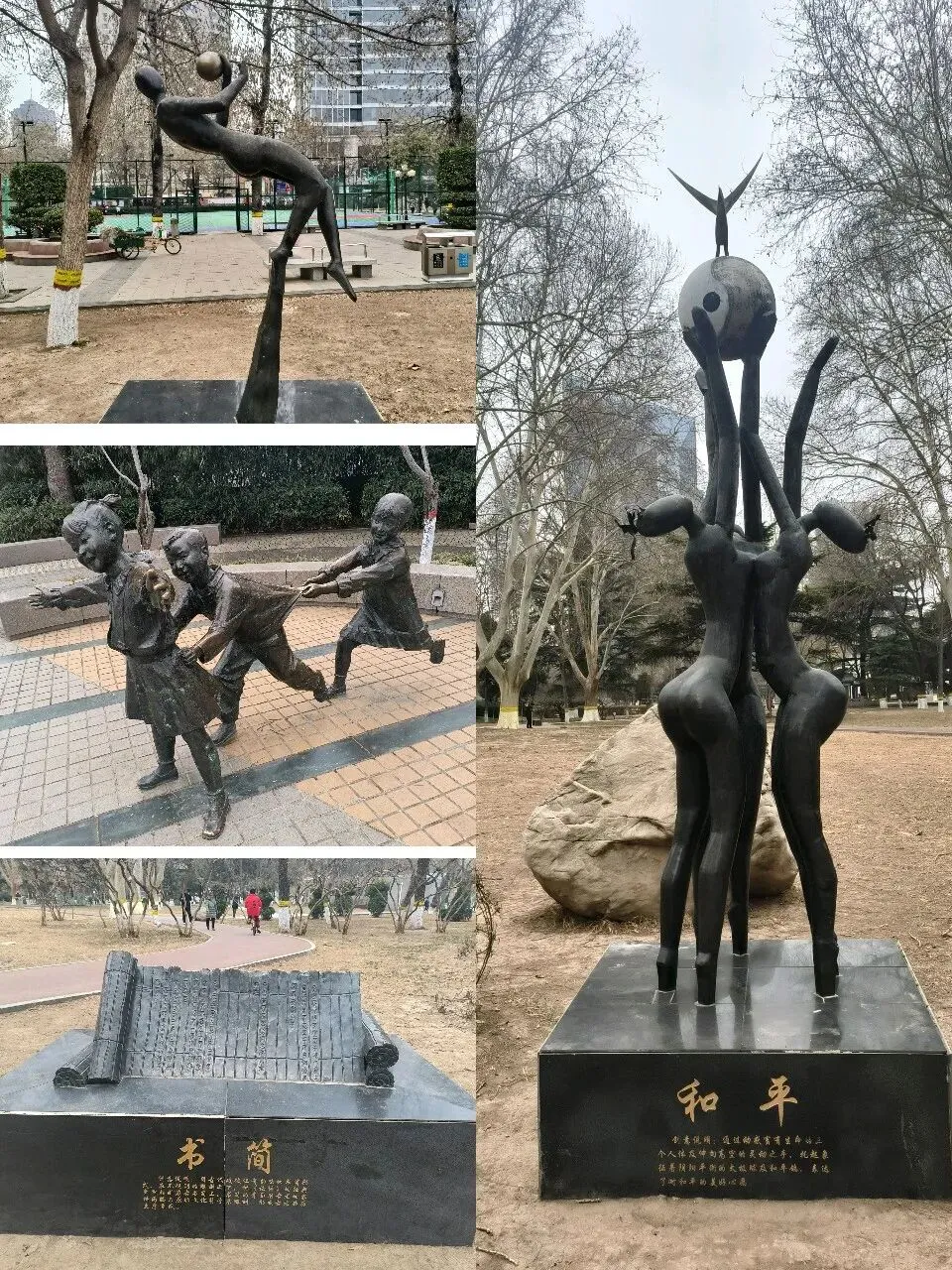 公园里还有几处固定的雕塑作品,也很有意境。《书简》的厚重,《和平》的祈愿,《投篮》的瞬间和《老鹰捉小鸡》的快乐,都是那么栩栩如生,寓意深远。当然,公园里最活跃也是最热闹的还是健身或娱乐的人群。有跳广场舞的、练太极拳的,有学练合唱或独唱歌曲的,有锣鼓喧天扭秧歌的,也有打扑克、下象棋的,还有环湖健步走的,在这些人群中,老年人居多,而且很多人是骑车或坐公交车从很远的地方过来的。如果说,大家第一次来这里是为了赏景,那么常来常往的就是一种爱好或者说是一种情怀了吧。长安公园位于市中心,交通便捷,环境优美,更适合休闲娱乐、健身赏景,如果有时间就来这里转转吧,不同的季节有不同的景色,“常来常新”,来到这里,你一定会流连忘返、不虚此行的。