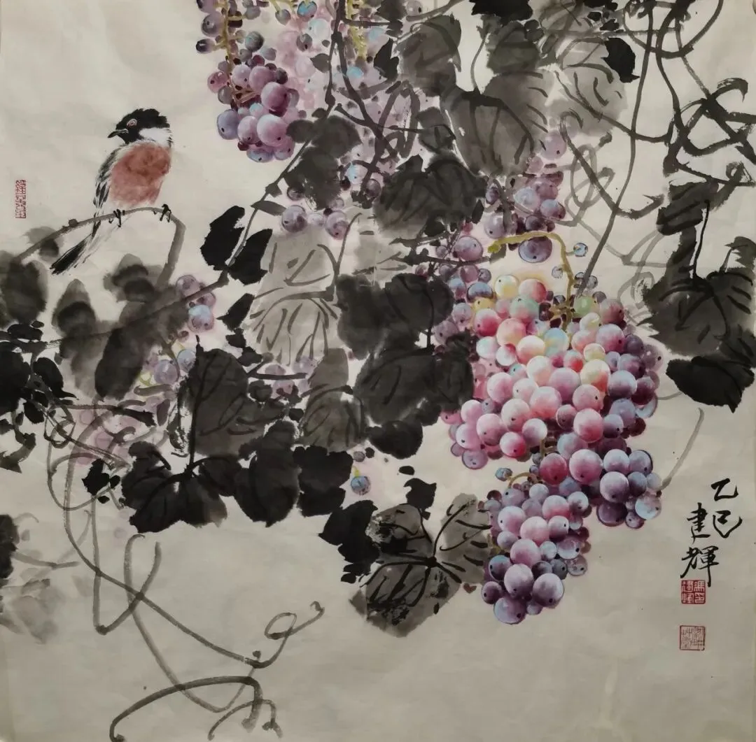 画面中,葡萄的四季轮回被赋予哲学意味:冬日蓄力、春日勃发、秋日丰收,恰似艺术家本人扎根乡土、潜心创作的生命轨迹。 这种将个人成长与自然物候相融合的创作理念,使作品超越了普通花鸟画的范畴。他不仅以精湛技艺赢得赞誉,更以"坚守心田之澄净"的艺术态度,为基层美术工作者树立了精神标杆。 其葡萄画作,实为精神家园的守望。