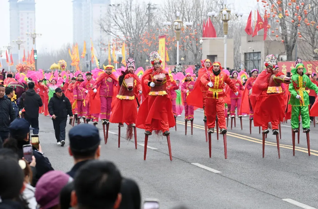 10时,巡游活动正式启动。37支巡游队伍、2700余名演职人员沿着冶河路载歌载舞向前行进。古韵悠长的散蜡鼓队、威武雄壮的舞龙舞狮队伍率先登场,一路欢歌一路起舞,将新春的喜庆氛围拉满。人民公园北口、荷花楼路口两大巡游表演场地,成为民俗文化集中展示的舞台;北国路口、福美佳门口、荷花楼路口三大暖场场地,平山镇组织的农村文艺团队轮番登台献艺。鼓声、歌声与欢笑声交织萦绕,冶河路俨然成为一道流动的文化风景线,让现场群众沉浸式感受新春的热闹与美好。