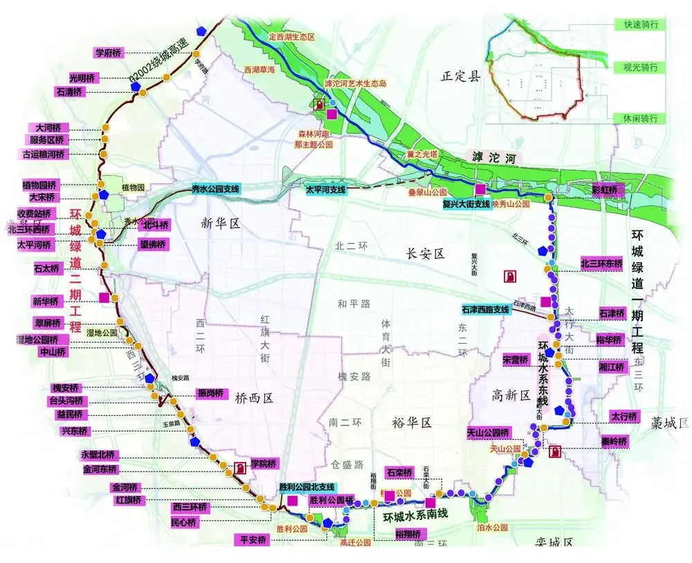 除公园建设外,石家庄还高标准建成了全长101公里的环城绿道,串联起沿线76座公园游园,让“我们一起去绿道”逐渐成为市民新的生活方式。民心河沿线37.5公里步道全线贯通,滹沱河生态区新建亲水广场、滨水栈道,让市民从“看水看绿”转变为“亲水亲绿”。