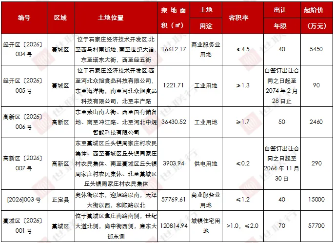 2026年第9周,共供应6宗土地,由高新区、藁城区、正定县供应,为1宗住宅用地,2宗商服用地,2宗工业用地,1宗其他用地,总面积236752.89平方米,起始总价80990万元。土地详表如下: